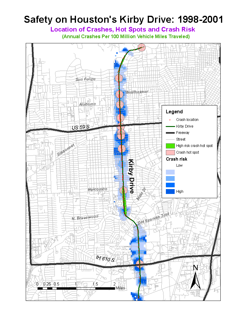 This map shows 1225 motor vehicle crashes that occurred on Kirby Drive, a seven mile long arterial in the City of Houston, between 1998 and 2001. The locations of the crashes are shown as red dots. CrimeStat was used to identify crash hot spots. First-order hot spots are shown in pink. These are locations with a high concentration of crashes and were identified with the nearest neighbor hierarchical clustering routine. Typically, crash hot spots occur where there are higher traffic volumes. Note the concentration of hot spots near the entry and exit points of the US 59 South and Interstate 610 South freeways. On the other hand, 'crash risk' is the number of crashes relative to the volume of traffic, usually measured in crashes per 100 million vehicle miles traveled (VMT). The duel kernel density routine was used to estimate crash risk (shown in blue). Finally, specific hot spots that have a high crash risk are shown in green. These were identified with the risk-adjusted nearest neighbor hierarchical clustering routine in CrimeStat.