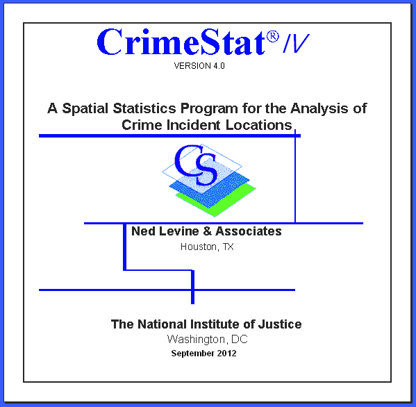CrimeStat is a spatial statistics program for the analysis of crime incident locations, developed by Ned Levine & Associates, which was funded by grants from the National Institute of Justice (grants 1997-IJ-CX-0040, 1999-IJ-CX-0044, 2002-IJ-CX-0007, and 2005-IJ-CX-K037). The program is Windows-based and interfaces with most desktop GIS programs. The purpose is to provide supplemental statistical tools to aid law enforcement agencies and criminal justice researchers in their crime mapping efforts. CrimeStat is being used by many police departments around the world as well as by criminal justice and other researchers. The latest version is 4.02 (CrimeStat IV). The program inputs incident locations (e.g., robbery locations) in 'dbf', 'shp', ASCII or ODBC-compliant formats using either spherical or projected coordinates. It calculates various spatial statistics and writes graphical objects to ArcView/ArcGIS, MapInfo, Atlas*GIS, Surfer for Windows, and Spatial Analyst. CrimeStat is organized into seven sections: Primary file - this is a file of incident or point locations with X and Y coordinates. The coordinate system can be either spherical (lat/lon) or projected. Intensity and weight values are allowed. Each incident can have an associated time value. Secondary file - this is an associated file of incident or point locations with X and Y coordinates. The coordinate system has to be the same as the primary file. Intensity and weight values are allowed. The secondary file is used for comparison with the primary file in the risk-adjusted nearest neighbor clustering routine and the duel kernel interpolation. Reference file - this is a grid file that overlays the study area. Normally, it is a regular grid though irregular ones can be imported. CrimeStat can generate the grid if given the X and Y coordinates for the lower-left and upper-right corners. Measurement parameters - This page identifies the type of distance measurement (direct, indirect or network) to be used and specifies parameters for the area of the study region and the length of the street network. New in CrimeStat IV is the ability to utilize a network for linking points. Each segment can be weighted by travel time, travel speed, travel cost or simple distance. This allows the interaction between points to be estimated more realistically. Spatial distribution - statistics for describing the spatial distribution of incidents, such as the mean center, center of minimum distance, standard deviational ellipse, directional mean, convex hull, Moran's I spatial autocorrelation index, Geary's C spatial autocorrelation index, Getis-Ord G spatial autocorrelation index, Moran correlogram, Geary correlogram, and Getis-Ord correlogram routines. Spatial autocorrelation - statistics for describing the amount of spatial concentration for zone data including Moran's I spatial autocorrelation index, Geary's C spatial autocorrelation index, Getis-Ord G spatial autocorrelation index, Moran correlogram, Geary correlogram, and Getis-Ord correlogram routines. Distance analysis I - statistics for describing properties of distances between incidents including nearest neighbor analysis, linear nearest neighbor analysis, and Ripley's K statistic. New in CrimeStat IV is a routine that assigns the primary points to the secondary points, either on the basis of nearest neighbor or point-in-polygon, and then sums the results by the secondary point values. Distance analysis II - calculates matrices representing the distance between points for the primary file, for the distance between the primary and secondary points, and for the distance between either the primary or secondary file and the grid.